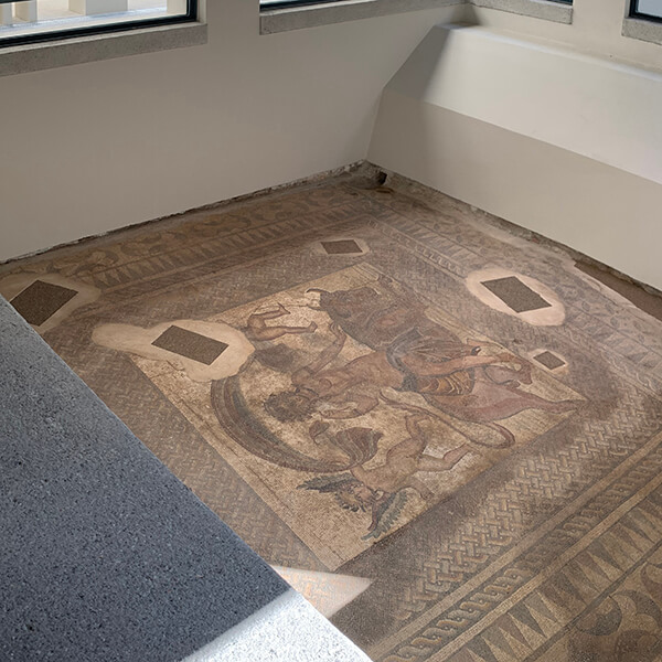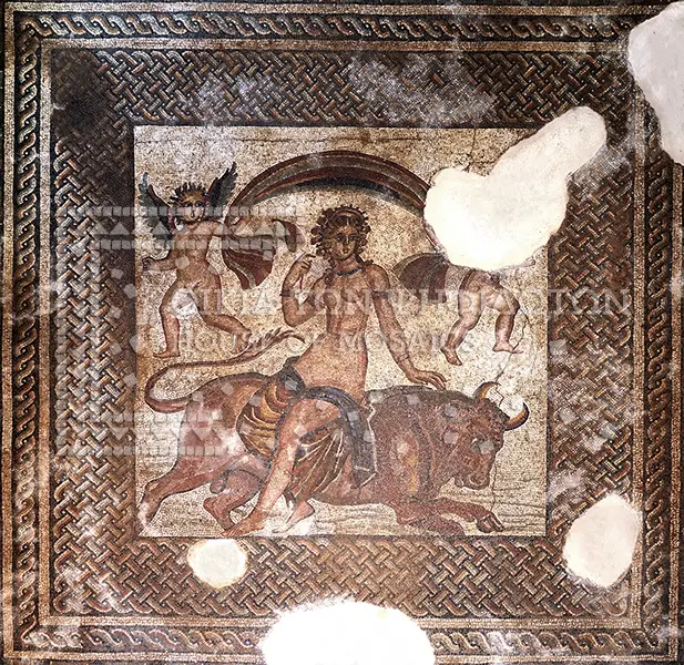 Ψηφιδωτό δάπεδο με παράσταση της αρπαγής της Ευρώπης από τον μεταμορφωμένο σε ταύρο Δία. Φτερωτοί ερωτιδείς κρατούν τον πέπλο της νεαρής γυναίκας.