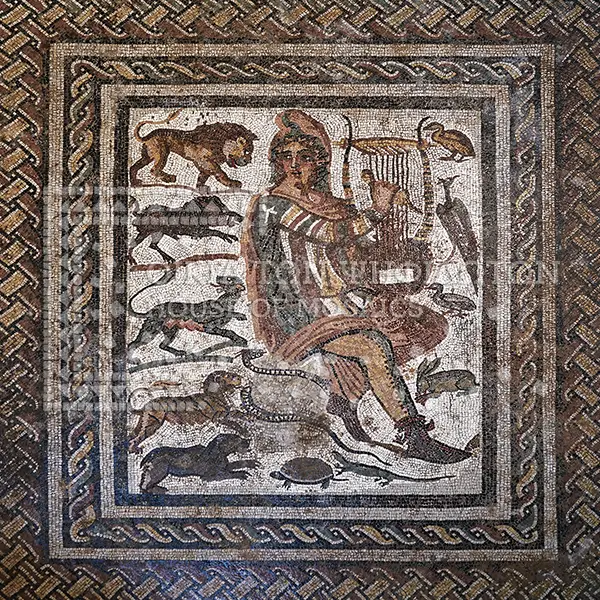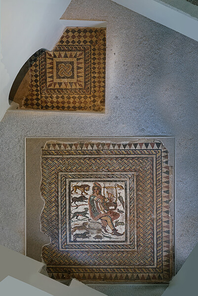 Ψηφιδωτό δάπεδο με παράσταση του Ορφέα που παίζει λύρα και σαγηνεύει τα ζώα (θηλαστικά, πτηνά και ερπετά).